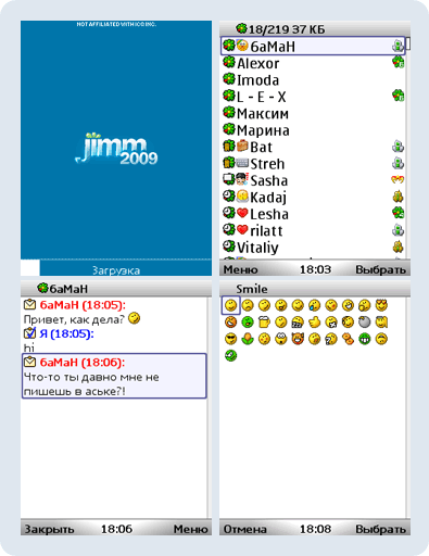 Новейшая модификация хорошо известной программы Jimm — безусловно, лучшая из версий. Постоянная поддержка, великолепный внешний вид и стабильность работы — все, что нужно для комфортного ICQ-общения! Особенности -Работает на большинстве современных телефонов: Nokia, Samsung, Sony Ericsson, Motorola и др. -Поддержка и автоматическое обновление — работает всегда! -Экономное потребление трафика. -Регистрация новых пользователей (ICQ-аккаунт). -Передача файлов, в том числе и фото с камеры. -Расширенная информация о собеседнике, доступная даже без подключения. -Настройка внешнего вида Jimm 2009 полностью «под себя». -Анти-спам фильтр, настройки приватности. -Контроль подключения — «ни единого разрыва» :) -Высокая скорость работы, все буквально летает! -Полностью на русском языке. -Расширенные статусы, анимированные смайлы и другие прелести. ИСПОЛЬЗУЕМ НА СВОЙ СТРАХ И РИСК