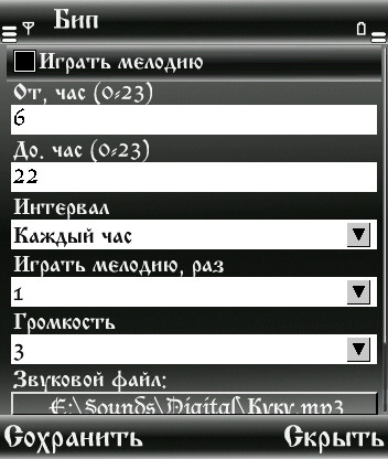 Автор-JBAK Программа подает звуковой сигнал в заданный промежуток времени,программа скрыта из диспетчера задач. Для входа в настройки нужно нажать на иконку программы в меню телефона. играть мелодию - позволяет включить/выключить подачу звукового сигнала от, час и до, час - позволяет задать промежуток времени, на котором будет подаваться сигнал. Здесь вводятся часы, от 0 до 23. Назначение от - первый час, когда будет подаваться звуковой сигнал, до - последний час. Например, если нужно подавать сигнал от 23:00 до 23:55 с интервалом 5 мин. - оба поля должны быть 23. интервал - здесь можно выбрать интервал подачи звукового сигнала. Например, если программа настроена в 12:03 на интервал в 5 минут - следующий сигнал будет подан в 12:05, потом в 12:10 и т.д. играть мелодию раз - сколько раз будет повторяться мелодия громкость - громкость мелодии Если в количестве повторов задать 0 - будет бить по количеству часов (1-12 раз)программу необходимо подписать.